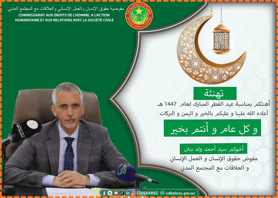 تهنئة معالي مفوض حقوق الإنسان و العمل الإنساني و العلاقات مع المجتمع المدني ، السيد سيد أحمد ولد بنان ،بمناسبة عيد الفطر المبارك.